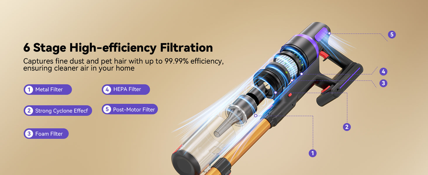 Captures fine dust and pet hair with up to 99.99% efficiency, ensuring cleaner air in your home