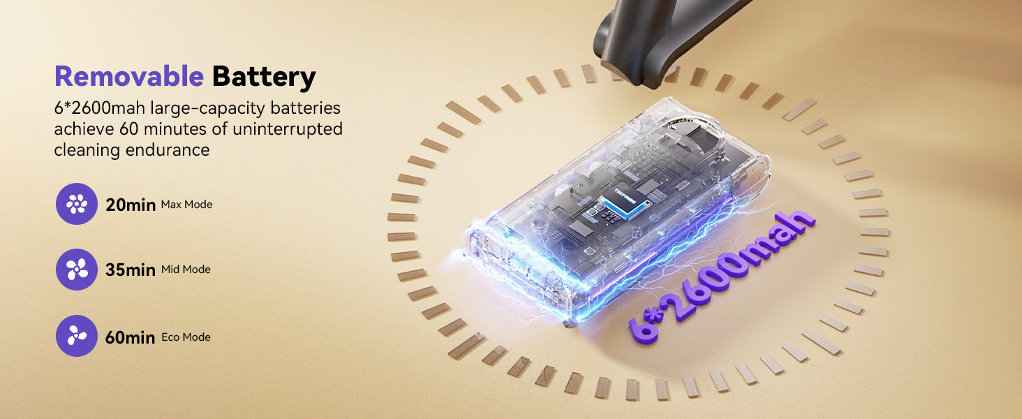 6*2600mah large-capacity batteries achieve 60 minutes of uninterrupted cleaning endurance
