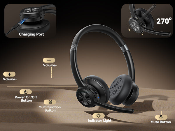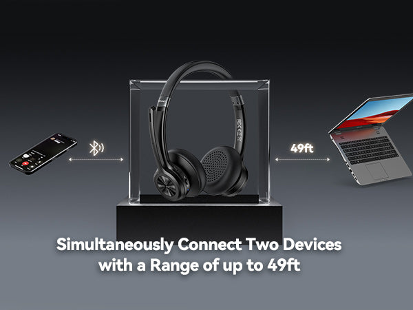 The wireless headphones are equipped with powerful Bluetooth and sound processing chips using the latest technology. Connect the wireless headset with a mic for work to two devices within seconds. The indoor connection range can reach 49 feet/15 meters.