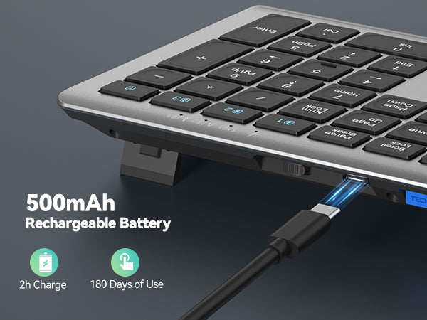 The TECKNET rechargeable keyboard has a built-in 500mAh large-capacity rechargeable battery, which means no more frequent battery changes, lasting up to 180 days on a single 2-hour charge (based on 2 hours of daily use). The keyboard wireless automatically enters sleep mode after 30 minutes of inactivity and wakes up instantly with any key press, ensuring no delays in your work.