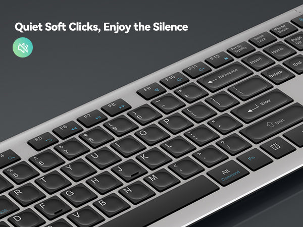 The silent keyboard is equipped with 110 upgraded scissor-switch keys, offering 90% noise reduction, durability up to 10 million keystrokes. The 2mm key travel and moderate rebound ensure comfortable typing, even during long sessions. The silk-screened, matte UV-coated keycaps are designed to be wear-resistant, while 12 multimedia keys enhance productivity.