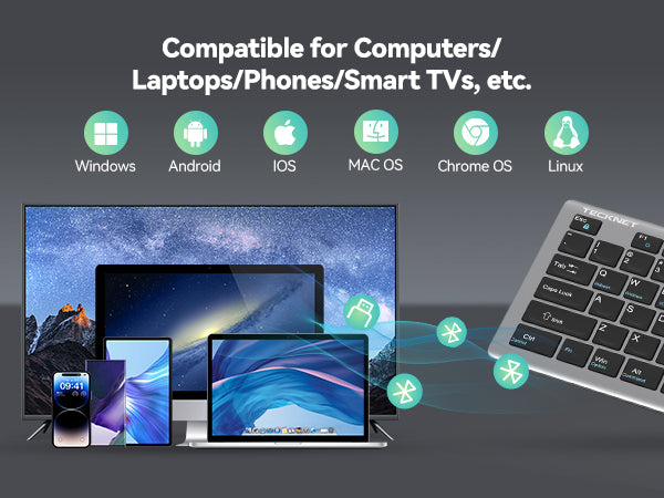 TECKNET slim wireless keyboard compatible with Windows, iOS, macOS, and Android. For devices without Bluetooth, simply use the included USB receiver for a stable connection.