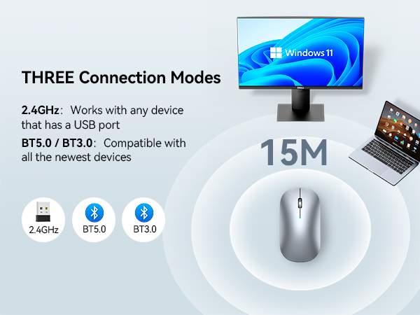Bluetooth 5.0/3.0 and 2.4GHz for you to choose from. The TECKNET Bluetooth wireless mouse allows you to switch freely between these three modes. With the Bluetooth connection mode, you can save a valuable USB port. The 2.4GHz USB receiver wireless technology enables plug-and-play functionality and provides a reliable working connection distance of up to 15M (49ft)