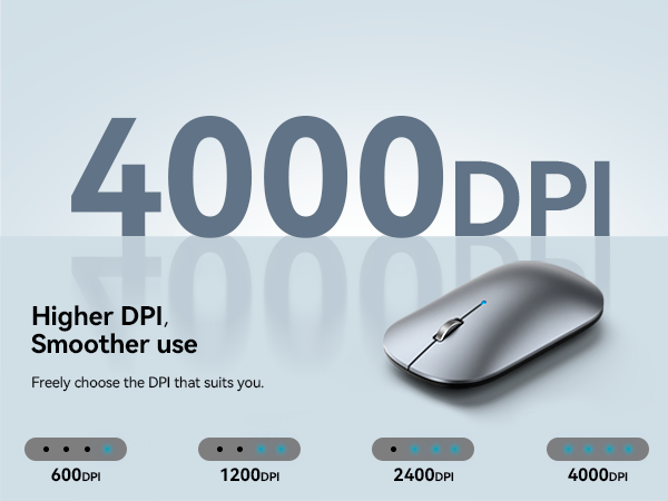 Move in silence with 90% button noise reduction, this mute mouse is ideal for public settings or in-office use. 4000/2400/1200/600DPI offers a wider range of applications, ensures smooth use on any surface.