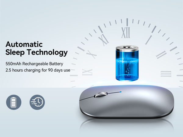 Built-in rechargeable battery, only 2.5 hours charge can provide you 12 weeks of daily use. Featuring auto sleep, quick wake up and long time standby this cordless mouse automatically enters sleep mode during inactivity. Simply click or move the mouse to return back to work.