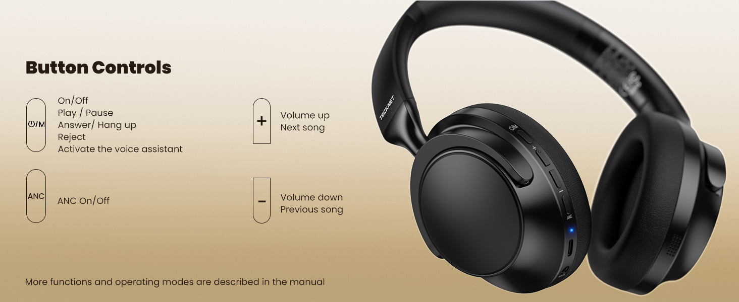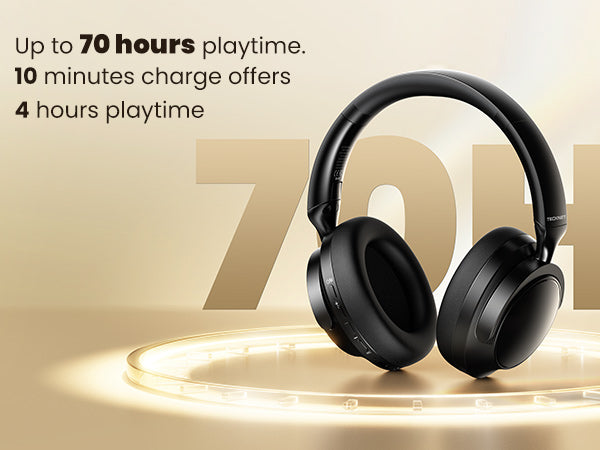 Enjoy up to 45 hours of music in active noise cancelling mode, or extend the playtime to 70 hours in standard mode. A quick 10-minute charge gives you 4 hours of listening. You can charge it through the Type-C port. NOTE: If you are not using your wireless headphones, turn off ANC to save power