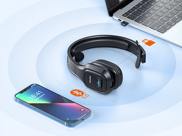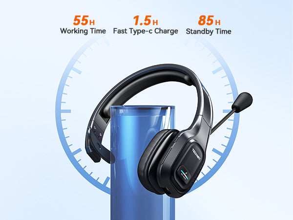TECKNET Trucker wireless headset provides up to 50h work time and 85 hours of standby time on a single charge. 1.5-hour full charge time with included type c cable.