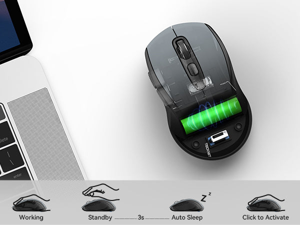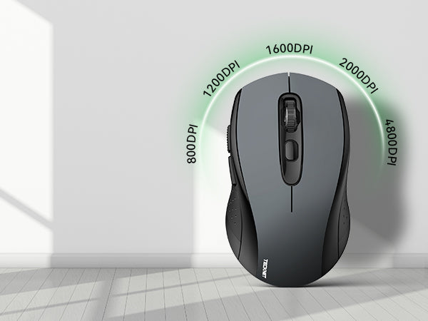 TECKNET Wireless mouse for laptop with 5 levels adjustable DPI - 4800/2000/1600/1200/800, easily change the cursor sensitivity depending on your need. It features 2.4GHz technology, supports plug and play - No need for a driver, and has a working range of up to 10 metres (33 feet)