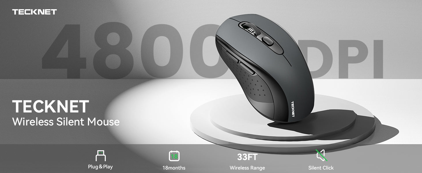 TECKNET Wireless Mouse for Laptop features 2.4G wireless connectivity, 5-level adjustable DPI up to 4800, and a silent click design. With 6 buttons, a portable USB receiver, and an impressive 18-month battery life, it's perfect for Mac, Chromebook, and PC users seeking precision and convenience.