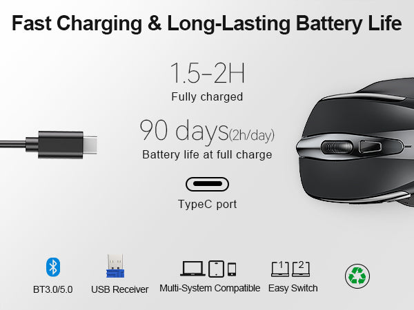 Say goodbye to constantly changing batteries. Our bluetooth mouse for laptop is rechargeable, taking only 1.5 to 2 hours to fully charge. Once fully charged, it provides around 3 months of usage (based on 2 hours of daily use). It's the perfect solution for those looking for a rechargeable wireless mouse. (A charging cable is included.)