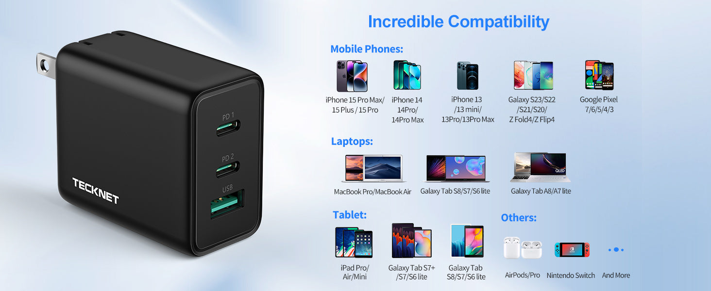 This charging block can deliver a quick charge with up to 65W for your mobile devices including a wide range of no more than 65W laptops, tablets, smartphones, mobile devices, and more.