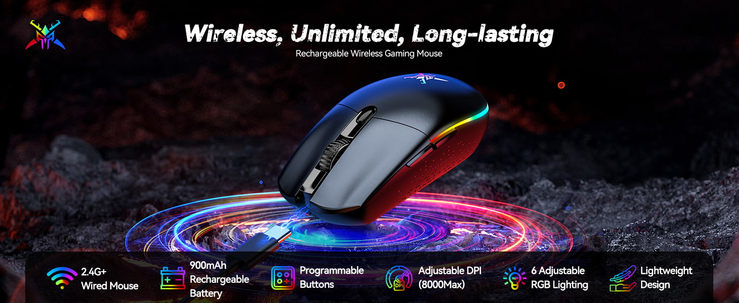 Enjoy the flexibility of both wired and 2.4G wireless modes. Whether you're at home or on the go, this gaming mouse features a 1ms report rate for lag-free, fast-paced action. With a 10-meter wireless range and low power consumption, you can play for hours without interruptions.