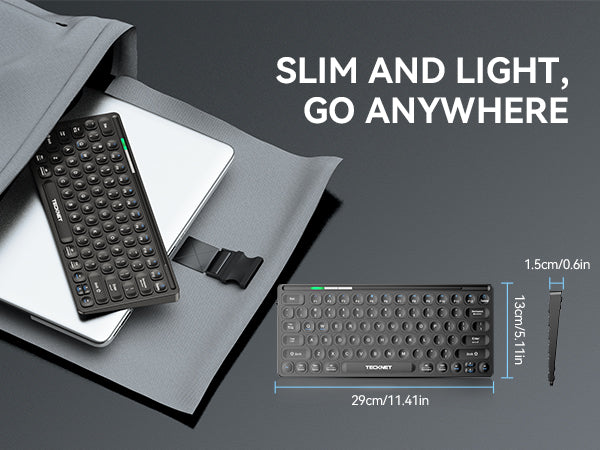 With its lightweight and compact design, the small wireless keyboard (29cm/11.41in x 13cm/5.11in x 1.5cm/0.6in, weighing 256g/0.21lb) easily fits into your laptop bag. This travel keyboard is perfect for use at home, in the office, or while traveling.