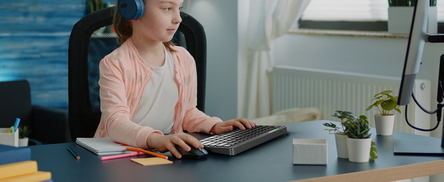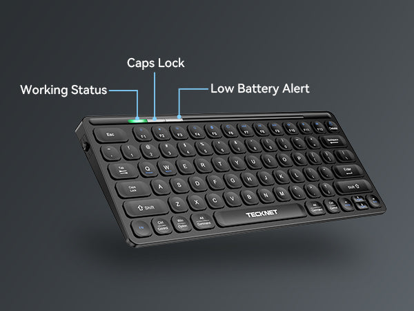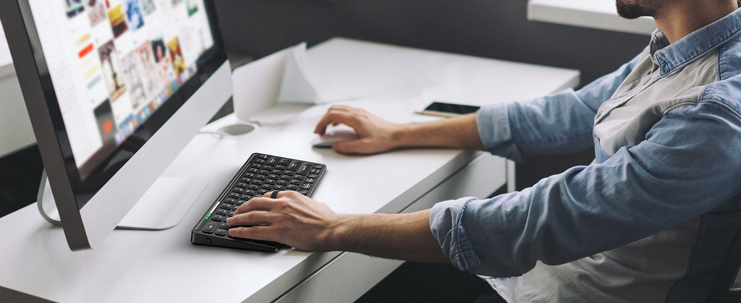 This mini wireless keyboard features an intelligent power-saving mode and an on/off switch, allowing it to be woken up with a single key press. It boasts a battery life of up to 1.5 months, assuming 2 hours of uninterrupted use per day.