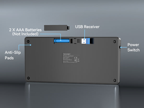 The Computer Keyboard leverages 2.4G wireless technology to provide a stable and powerful connection with a range of up to 15 meters (49 feet). The USB receiver is stored on the back of the keyboard next to the battery slot.