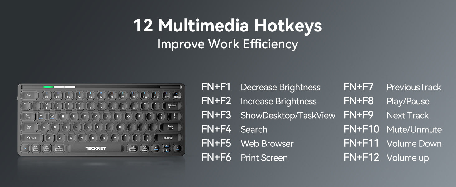 Thecompact wireless keyboard comes equipped with 12 multimedia hotkeys, allowing for easy access to music playback, web browsing, email, and more, thereby enhancing convenience and efficiency.