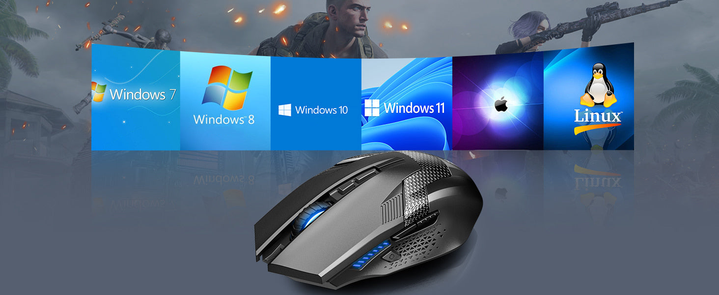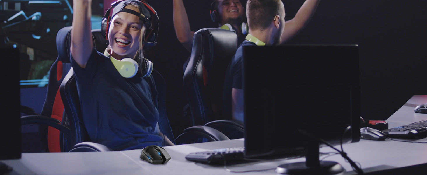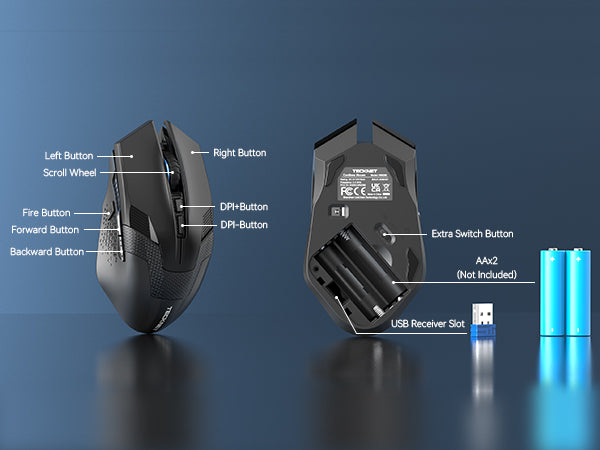 Featuring with auto power-off function, the PC gaming mouse automatically turns off when the nano USB receiver is not connected, or the PC is off. Only 2 AA batteries supports up to 12 months of battery life.