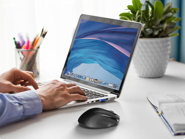Wireless mouse comes with a tiny USB Nano receiver (stored within the back of the mouse), plug it into your PC, and then forget it.